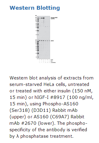 Phospho-AS160 (Ser318) (D3D11) Rabbit mAb兔单抗用于检测内源性318位丝氨酸磷酸化的AS160蛋白水平.该单抗通过用与人AS160蛋白Ser588位点周围残基序列相同的合成肽免疫动物制备而得。多肽类激素胰岛素是控制能量代谢如糖脂代谢的一个主要激素。胰岛素结合并激活胰岛素受体酪氨酸激酶,受体酪氨酸激酶可以招募并磷酸化各种接头蛋白。在骨胳肌和脂肪细胞中,由胰岛素及其受体引发的信号通路可以增加细胞的糖摄入,这是通过将Glut4葡萄糖转运小体从胞浆转运到质膜上实现的(1)。有一种分子量的160 kDa的AKt丝氨酸/苏氨酸激酶底物(AS160,TBC1D4)是一种Rab GTP酶激活的蛋白质,它可以调节胰岛素介导的Glut4转运。AS160在多种组织中表达,包括大脑,肾脏,肝脏,白色脂肪及棕色脂肪(2)。在体内,已经鉴定出一多个AS160蛋白的AKt激酶磷酸化位点,其中的五个位点(Ser318, Ser570, Ser588, Thr642, 和Thr751),在用胰岛素处理后,磷酸化水平增加(2,3)。一些用重组AS160蛋白的研究表明,胰岛素诱导的AS160磷酸化是GLUT4的转运过程中的一个重要步骤(3),并且在2型糖尿病中,该蛋白的磷酸化水平降低(4)。14-3-3调节蛋白与Thr642磷酸化AS160的结合是GLUT4的转运过程中的一个必需步骤(5)。在浓度诱导的GLUT4的转运中,AMPK对AS160的磷酸化也参与其中。