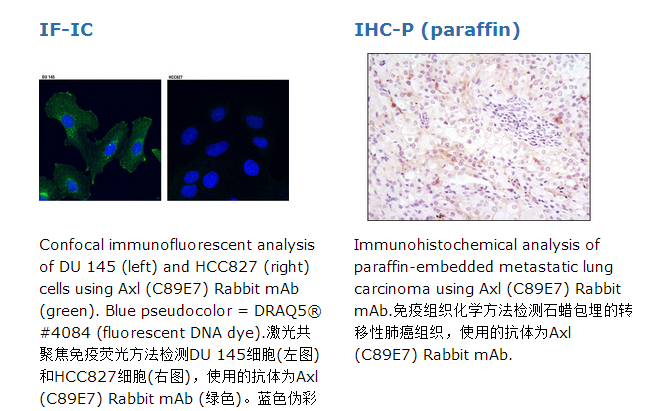 Axl (C89E7) 兔单抗能够检测内源性水平的总Axl蛋白。该抗体不与相关蛋白发生交叉反应。该单克隆抗体通过用重组蛋白免疫动物制备,该重组蛋白是人Axl蛋白片段。Axl、 Sky和 Mer是 受体酪氨酸激酶 (RTK) 家族的三个成员,它们有共同的胞内酪氨酸激酶区域和与胞外粘附分子相似的胞外区。这些受体酪氨酸激酶与维生素K依赖性的生长停滞特异性6蛋白(Gas6)结合,Gas6蛋白与S抗凝血因子蛋白结构上相关(1)。与受体结合后,Gas6能够激活PI3K激酶和它的下游靶分子Akt、 S6K和 NF-κB (2,3)。大量证据表明Gas6/Axl信号通路与正常细胞和癌细胞的生长和存活相关(4)。