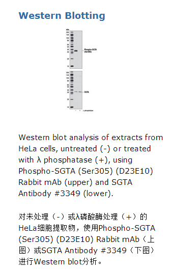 Phospho-SGTA (Ser305) (D23E10) Rabbit mAb兔单抗可识别内源性的Ser305磷酸化的SGTA水平。该单克隆抗体用与人类SGTA蛋白中Ser305位点附近的氨基酸序列对应的人工合成磷酸化肽段免疫动物而制成。SGTA(小的富含谷氨酸tetratricopeptide重复序列的蛋白A),是广泛表达的分子伴侣,可以直接结合HSC70和HSP70,调节它们的ATP酶活性(1,2)。SGTA是一个34kDa的蛋白质,在羧基末端富含谷氨酸残基,包含三个串联重复TPR基序(3)。SGTA的TPR区域显示出与Hop、CHIP和TOM70中TPR区域的序列相似性(4)。SGTA的TPR区域也能和HSP90相互作用,近来也被发现是一种促凋亡因子(5,6)。SGTA的Ser305磷酸化位点由CST公司使用PhosphoScan®技术鉴定的,这个技术是CST的基于LC-MS/MS的磷酸化发现平台(7)。位点特异性的突变分析表明Ser305的磷酸化对于PDGFRα的稳定和PDGFRα依赖的癌细胞生存至关重要(7)。
