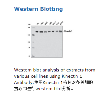 Polyclonal antibodies are produced by immunizing animals with a synthetic peptide corresponding to residues near the amino terminus of human kinectin 1 protein. Antibodies are purified by protein A and peptide affinity chromatography.