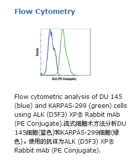 ALK (D5F3) XP® 兔单抗(PE偶联)能够检测内源性水平的总ALK蛋白以及ALK融合蛋白,如EML4-ALK变异体和 NPM-ALK,即使在低水平下。该抗体不与其他家族成员发生交叉反应。该单克隆抗体通过用重组蛋白免疫动物而制备,该重组蛋白是人ALK羧基末端附近的残基。该Cell Signaling Technology抗体与藻红蛋白(PE)结合,内部测试在人细胞中进行直标流式细胞分析。该抗体与未标记的ALK (D5F3) XP®兔单抗#3633.预期表现出同一物种的交叉反应。间变性淋巴瘤激酶(ALK)是多效生长因子(PTN)的酪氨酸激酶受体,它是大脑胚胎发育过程中的生长因子(1-3)。 在表达ALK的细胞中,PTN诱导ALK及其下游效应因子IRS-1, Shc, PLCγ, 和PI3K激酶发生磷酸化(1)。ALK最初是从易位突变产生的NPM-ALK融合蛋白而被发现的(4)。NPM-ALK融合蛋白是一个组成性活化,有原癌基因活性的间变性淋巴瘤相关酪氨酸激酶(4)。 由NPM-ALK介导的PLCγ的活化可能对有丝分裂活性起到关键作用,并且可能对间变性淋巴瘤的发病过程很重要(5)。另一个完全不同的ALK原癌融合蛋白在非小细胞肺癌细胞株中被报道,该蛋白融合了ALK与EML4(棘皮动物微管结合蛋白样4),其相应融合转录产物在一些肺腺癌中也有表达。在EML4-ALK融合蛋白中,微管相关蛋白EML4的短氨基末端区域和ALK的激酶活性区域融合在一起(6-8)。调查发现ALK与其他融合伴侣的易位,如TRK-融合基因(TFG)和KIF5B,也与非小细胞肺癌有关(6,7)。特别是EML4-ALK融合蛋白已经在3-7%的非小细胞肺癌样品被发现(6-14)。