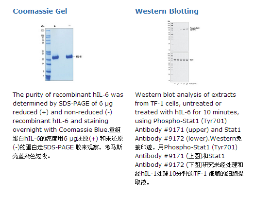 CST公司在大肠杆菌中生产重组人蛋白IL-6 (hIL-6) Val30-Met212 (Accession #NM_000600)。基于氨基酸测序结果,60%以上的重组hIL-6蛋白在N-末端具有Met标签Val30(序列为MVPPG),据推算分子量为20,943Da。其余的蛋白在pro 32 (序列PPGGE)或Pro33 (序列PGGED)位点起始。DTT-还原蛋白作为23kDa多肽而迁移,而未还原的蛋白由于具有内部二硫键,作为22kDa多肽而迁移。6 μg 还原 (+) 和 非还原的(-) 重组 hIL-6通过SDS-PAGE检测,纯度大于98%,所有批次的纯度均高于98%。重组蛋白hIL-6的生物活性是通过TF-1细胞增值实验确定的。每个批次的ED50在0.2-0.7 ng/ml之间。每微克hIL-6内毒素含量小于0.01 ng 。