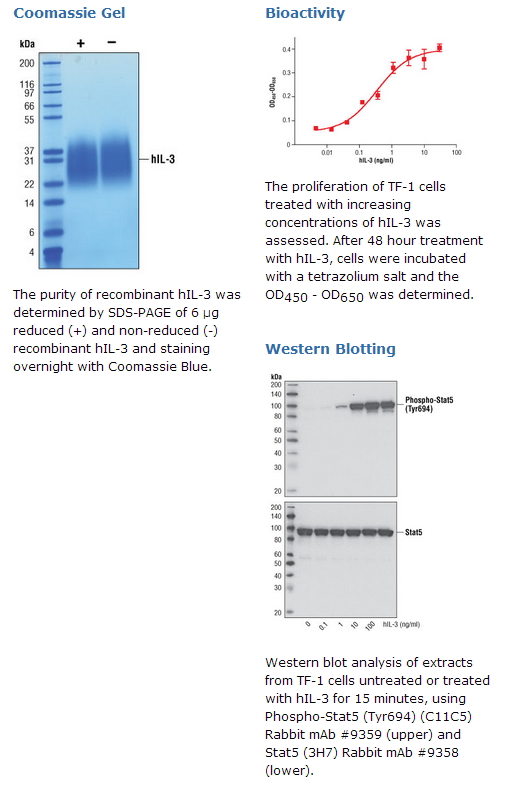 CST公司生产的人源重组蛋白白介素3 (hIL-3) Ala20-Phe152 (Accession # NP_000579)是从人源293细胞表达而来。重组的hIL-3蛋白在末端没有标签,未糖基化的蛋白分子量据推算为15,091Da。DTT-降解蛋白和未降解蛋白作为一个26kDa的蛋白而转移。低迁移率和在SDS胶镇南关的不同性质系糖基化的原因。重组hIL-3蛋白的N-末端APMTQ的序列通过测序得到。6 μg 还原 (+) 和 非还原的(-) hIL-3通过SDS-PAGE检测,纯度大于98%,所有批次的纯度均高于98%。重组蛋白hIL-3的生物活性是通过TF-1细胞的增殖实验确定的。每个批次的ED50值在50 -400 pg/ml之间。内毒素含量:小于0.01 ng /1 μghIL-3。