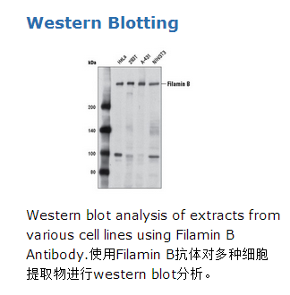 Filamin B Antibody recognizes endogenous levels of total filamin B protein. This antibody detects a 100 kDa background band of unknown origin. Based on the amino acid sequence, this antibody is not expected to cross-react with filamin A or filamin C.