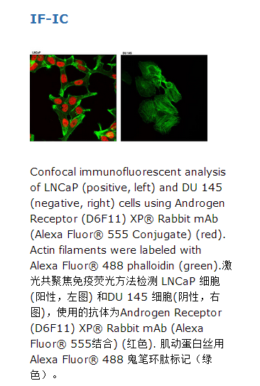 Androgen Receptor (D6F11) XP® Rabbit mAb (Alexa Fluor® 555结合) 能够检测内源性水平的总雄激素受体蛋白。该单克隆抗体是由对应人雄激素受体蛋白靠近氨基末端残基的重组蛋白免疫动物而生产的。该Cell Signaling Technology抗体与Alexa Fluor® 555荧光染料结合,并直接用流式细胞术内部测试检测人体细胞。预计该抗体与非结合的Androgen Receptor (D6F11) XP® Rabbit mAb #5153一样,表现出相同的物种交叉反应。雄激素受体(AR)是锌指转录因子,属于核受体超家族,通过磷酸化和配体结合的二聚化被激活(1)。这促进了细胞核定位和雄激素靶基因中雄激素与应答元件的结合。 AR在男性发育和前列腺癌发展的几个阶段起着至关重要的作用(2,3)。