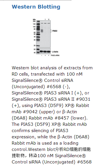 SignalSilence® PIAS3 siRNA I from Cell Signaling Technology (CST) allows the researcher to specifically inhibit PIAS3 expression using RNA interference, a method whereby gene expression can be selectively silenced through the delivery of double stranded RNA molecules into the cell. All SignalSilence® siRNA products from CST are rigorously tested in-house and have been shown to reduce target protein expression by western analysis.