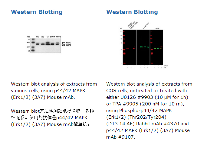 p44/42 MAPK (Erk1/2) (3A7) Mouse mAb鼠单抗能够检测内源性p44/42 MAPK(Erk1/Erk2)总蛋白水平。该抗体不能与JNK/SAPK 、p38 MAP 激酶发生交叉反应。该单克隆抗体是采用合成的与p44/42 MAPK蛋白序列相一致的肽段免疫动物而产生的。丝裂原活化蛋白激酶(MAPKs)是一个具有广泛保守性的丝氨酸/苏氨酸蛋白激酶家族,在许多细胞过程中起作用,比如细胞增殖、分化、运动和死亡。p44/42 MAPK (Erk1/2)信号转导通路能在应答各种胞外刺激后被激活,这些刺激因子包括有丝分裂原、生长因子和细胞因子(1-3),并且被研究者认为是诊断和治疗癌症的重要靶点(4)。受到刺激后,三个不同层次的蛋白激酶级联反应就连续被开启,这三个层次的分子包含MAPKKK(MAP3K)、MAPKK(MAP2K)、MAPK。多种p44/42 MAP3Ks已经被鉴定出来,包括Raf家族成员,以及Mos、Tpl2/Cot。MEK1、MEK2是该通路中主要的MAPKKs(5,6)。MEK1、MEK2通过分别磷酸化p44和p42蛋白的活化环内的Thr202/Tyr204位点和Thr185位点/Tyr187位点,从而激活p44、p42。目前已经鉴定出p44/42的一些下游靶点,包括p90RSK (7) 和下游转录因子Elk-1 (8,9)。双特异性(Thr/Tyr) MAPK磷酸酶家族成员DUSPs、MKPs (10),以及MEK抑制子如U0126、 PD98059,可以负调节p44/42。