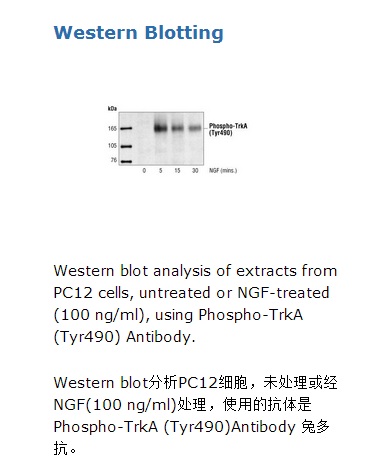 Phospho-TrkA (Tyr490) Antibody detects endogenous levels of Trk only when phosphorylated at tyrosine 490. This antibody also detects TrkB and TrkC when phosphorylated at the corresponding residues.