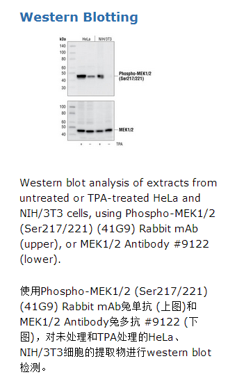 Phospho-MEK1/2 (Ser217/221) (41G9) Rabbit mAb兔单抗能够检测内源性Ser217/221位点磷酸化的MEK1/2蛋白水平。该单克隆抗体是采用合成的与人源MEK1/2蛋白Ser217/221位点周围序列相一致的磷酸化肽段免疫动物而产生的。MEK1、MEK2,也被称为MAPK或Erk激酶,它们是双特异性蛋白激酶,在丝裂原活化蛋白激酶级联反应中发挥作用,控制细胞生长和分化(1-3)。MEK1、MEK2的活化是通过Raf样分子对两个丝氨酸(217 /221位点)的磷酸化而实现的,这两个丝氨酸位点位于亚结构域VIII的活化环内。多种生长因子和细胞因子以及膜去极化和钙内流都能激活MEK1/2(1-4)。组成型活化的MEK1/2能够诱导NIH/3T3细胞的转化和PC-12细胞的分化(4)。MEK蛋白通过将p44、p42 MAPK激酶上位于亚结构域VIII的活化环内的丝氨酸和苏氨酸磷酸化,激活p44、 p42 MAPK激酶。