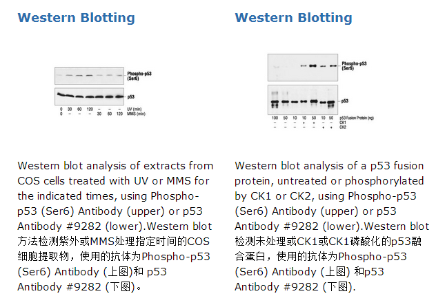 Phospho-p53 (Ser6) Antibody detects endogenous levels of p53 only when phosphorylated at serine 6. The antibody does not cross-react with p53 phosphorylated at other sites.