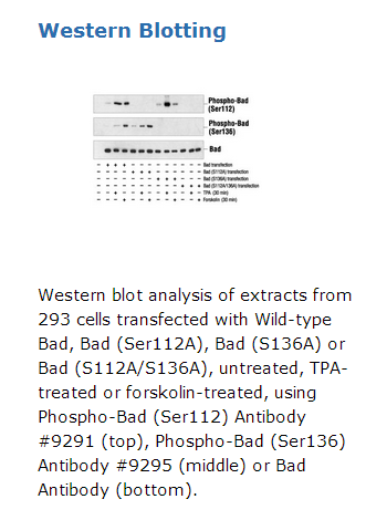 Polyclonal antibodies are produced by immunizing animals with a synthetic peptide corresponding to residues surrounding Ser112 of mouse Bad. Antibodies are purified by protein A and peptide affinity chromatography.