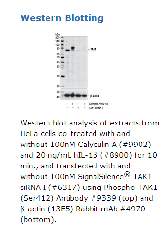 Phospho-TAK1 (Ser412) Antibody detects endogenous levels of TAK1 only when phosphorylated at serine 412.