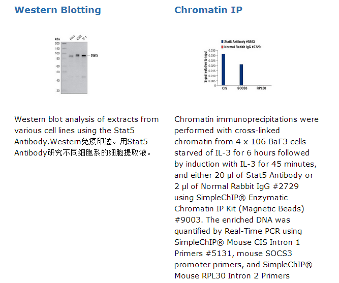 Stat5 抗体能检测内源总体水平的 Stat5α 和 Stat5β蛋白。此多克隆抗体是通过合成对应人源性Stat5 N-末端区域的肽段免疫动物而获得。 抗体是通过protein A和多肽亲和层析法纯化。Stat5的激活是通过一系列的配体的结合而完成,包括 IL-2, GM-CSF,生长激素和泌乳刺激素。磷酸化Tyr694位点对 Stat5的活性是必须的(1,2)。此位点的磷酸化是在红细胞生成素的作用下由Src介导而完成(3)。 Stat5在某些白血病类型的细胞中有组成性的活性(4)。用IL-3处理的内皮细胞中有磷酸化的Stat5,这就表明它参与了血管再生和细胞的运动(5)。在不同细胞类型中 Stat5a 和 Stat5b 是被独立调控和激活的。例如,干扰素处理后在U-937细胞中Stat5a的活性较强但在HeLa细胞中Stat5b的活性较强(6)。