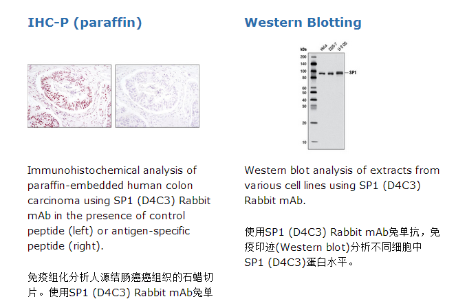 SP1 (D4C3) Rabbit mAb兔单抗能够检测内源性SP1总蛋白水平。该单克隆抗体是采用合成的与人源SP1蛋白的Pro593残基周围序列相对应的肽段免疫动物而生产的。Specificity protein 1 (SP1)是一个广泛表达的转录因子,它属于包含DNAC2H2-type锌指的DNA结合蛋白。SP1高亲和力地结合到GC富含区,并且调节哺乳动物基因的表达(1,2)。它与许多其它转录因子例如c-Myc、Egr1和Stat1以及基本的转录组件相互作用。SP1与在染色质修饰中染色质修饰因子例如组蛋白去乙酰酶(HDACs)和p300。SP1的转录活性和稳定性通过翻译后修饰被调节,包括磷酸化、乙酰化、泛素化和糖基化(3)。在胰岛素处理下SP1的糖基化导致细胞核定位的增加,而胰高血糖素处理可增加细胞质的SP1水平(4-6)。研究者发现在阿尔茨海默病(AD)中SP1是有高表达的。