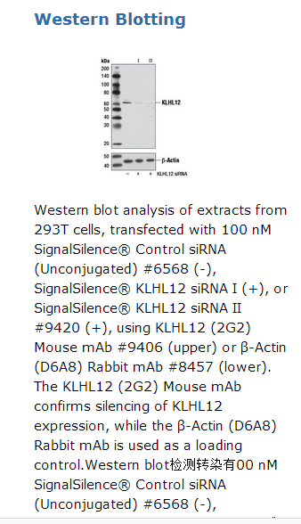 SignalSilence® KLHL12 siRNA I from Cell Signaling Technology (CST) allows the researcher to specifically inhibit KLHL12 expression using RNA interference, a method whereby gene expression can be selectively silenced through the delivery of double stranded RNA molecules into the cell. All SignalSilence® siRNA products from CST are rigorously tested in-house and have been shown to reduce target protein expression by western analysis.