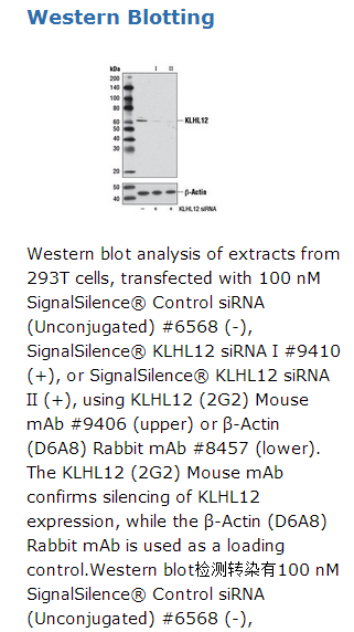 KLHL12 siRNA II 抑制人和猴中KLHL12的表达。来自Cell Signaling Technology (CST)的SignalSilence®KLHL12 siRNA II 可以帮助研究者通过RNA干扰特异性地抑制KLHL12的表达,这种方法可以通过将双链RNA分子传递到细胞内从而使基因表达有选择的沉默。来自CST的所有的SignalSilence®siRNA产品都是经过内部严格检测的,并且通过Western blot 分析证明确实能够减少目的蛋白的表达。通过三苯甲基分析每个碱基以监测寡核苷酸的合成,确保合适的配对效率。随后寡核苷酸通过亲和固相萃取法纯化。退火的RNA双链通过质谱分析来证实其精确的组成。每一批产品都通过质谱分析与前面的产品进行比较,来保证不同批次之间的最大一致性。CST推荐使用100 nM SignalSilence®KLHL12 siRNA II进行转染,48到72小时后对细胞进行裂解。转染步骤按照转染试剂说明书提供的步骤进行。遇到任何使用方面的问题,请随时联系CST。每小瓶可供100次转染,每次转染量相当于在转染24孔板时,每孔总体积为300μl培养基中siRNA的终浓度为100nM。Cullins是以SCF(Skp1-CUL1-F-box)为代表的模式化的泛素连接酶的分子支架蛋白(1-3)。这些E3连接酶的底物选择,主要是通过特定的模块与cullins的结合实现。在SCF复合物中,这一分子由直接与CUL1结合的Skp1,以及F-box蛋白家族诸如Skp2的一个成员组成(1-4)。CUL3已经被证实是哺乳动物和秀丽隐杆线虫胚胎发育所必需(5-7),但最近,它的底物特异性接合体尚未被阐明。目前已经证实,基于CUL3的泛素连接酶复合物的底物调节剂,包含了一种保守的BTB/POZ (Pox virus and Zinc finger)结构域。这一结构域,最初在果蝇转录抑制复合物中被发现,并存在于190多种人蛋白。BTB蛋白包括许多蛋白-蛋白相互作用结构域,包括MATH结构域,锌指重复序列和kelch重复序列(8)。一系列的证据表明Kelch-like 12 protein (KLHL12)是基于CUL3的泛素连接酶复合物的底物特异调节剂。有关KLHL12氨基酸序列的分析表明,BTB氨基末端的模序,一个中心的链接区域,以及由kelch重复序列组成的羧基末端kelch结构域。此外,已经证实KLHL12,通过散乱的结合,以及为泛素依赖的蛋白酶体降解的靶向作用,可以负向调节Wnt信号转导(9)。此外最近,KLHL12被证实通过促进COPII组分Sec31单泛素化修饰,可以促进大COPII小囊泡的组装。因此,CUL3-KLHL12-依赖的泛素化是胶原排出的必需的,其更是整合素依赖的鼠胚胎干细胞分裂所必需的步骤(10)。