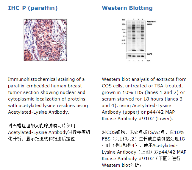 Acetylated-Lysine Antibody detects proteins posttranslationally modified by acetylation on the epsilon-amine groups of lysine residues. The antibody recognizes acetylated lysine in a wide range of sequence contexts. It has been demonstrated to recognize acetylated histones, p53, CBP, PCAF and chemically acetylated BSA. The antibody has been shown to react with as little as 0.04 ng of chemically acetylated BSA while not recognizing up to 25 µg of nonacetylated BSA. (U.S. Patent No's.: 6,441,140; 6,982,318; 7,259,022; 7,344,714; U.S.S.N. 11,484,485; and all foreign equivalents.)