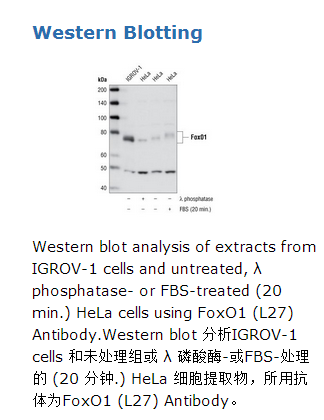 FoxO1 (L27)Antibody可以检测外源性和内源性总Fox01蛋白。此抗体内源性Fox04或Fox03a发生交叉反应, 此抗体可以与大小95kDa的未知蛋白发生交叉反应。多克隆抗体是采用来源于鼠Fox01蛋白氨基末端的氨基酸相对应的合成肽段免疫动物生产的。抗体由protein A和肽亲和层析法纯化。Forkhead转录因子家族参与横纹肌肉瘤和急性白血病的发生(1-3)。在这个家族中,三个成员(FoxO1,FoxO4和FoxO3a)与线虫的同源基因DAF-16具有序列相似度,而DAF-16介导包括IGFR1,PI3K和Akt在内的信号通路(4-6)。活化的forkhead成员作为肿瘤抑制因子,促进细胞周期阻滞和凋亡。FOXO家族任何成员的表达上调都会激活细胞周期抑制剂p27 Kip1。Forkhead转录因子也参与TGF-β介导的p21 CIP1上调,而这个上调过程可以被PI3K负调控(7)。forkhead转录因子被Akt在Thr24,Ser256以及Ser319磷酸化后而失活,导致出核转运与转录因子活性的抑制(8),最终导致增殖增加。Forkhead转录因子活性也可以被去乙酰化酶sirtuin(SirT1)抑制(9)。