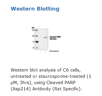 Cleaved PARP (Asp214) Antibody (Rat Specific) detects endogenous levels of the large fragment of rat PARP1 (89 kDa) resulting from caspase cleavage. The antibody does not recognize full length PARP1 or other PARP isoforms.