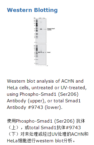 Phospho-Smad1 (Ser206) Antibody detects endogenous levels of Smad1 only when phosphorylated at Ser206. No cross reactivity was detected with other famly members.