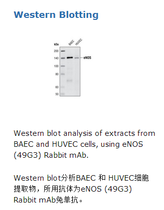 eNOS (49G3) Rabbit mAb兔单抗可以检测内源性总eNOS蛋白。单克隆抗体是采用合成的与人类eNOS蛋白序列相对应的肽段免疫动物生产的。内皮一氧化氮合酶(eNOS)是心血管系统的一种重要的酶。它可以催化合成一氧化氮(NO)。NO是一种血压,血管重建和生成的重要的调节因子(1,2)。eNOS的活性受多个位点磷酸化的调控。研究最为透彻的两个位点是激活位点Ser1177 和抑制位点Thr495(3)。几种蛋白激酶包括Akt/PKB, PKA 和AMPK都可以在不同的刺激下通过 Ser1177位点的磷酸化来激活eNOS的活性(4,5)。相反,血管舒缓激肽和过氧化氢通过促进Ser1177的磷酸化和Thr495的去磷酸化来激活eNOS的活性(6,7)。
