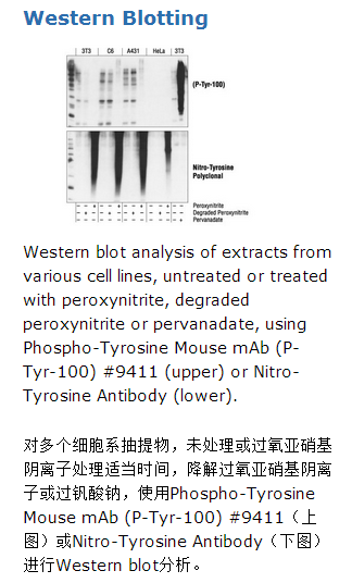 Nitro-Tyrosine Antibody兔多抗可以识别包含硝基酪氨酸的蛋白或肽段,不受周围氨基酸序列影响。这是发现新的硝基蛋白、分析蛋白硝基化和测量组织样本中硝基蛋白含量的有用工具。此抗体不与未修饰的酪氨酸或磷酸化酪氨酸发生交叉反应。(美国专利号:6,441,140、6,982,318、7,259,022、7,344,714;U.S.S.N. 11,484,485;及所有国外相应专利)该多克隆抗体用合成的包含硝基化酪氨酸的肽段免疫动物制备。该抗体使用蛋白A和蛋白亲和层析纯化制备。一氧化氮(NO)与肿瘤生成(1)、慢性感染、炎症(2)和神经退行性病变(3)有关。组织中高水平的过氧化物或一氧化氮相互作用形成过氧硝酸盐,它可以将蛋白中的酪氨酸残基转化为3-硝基-酪氨酸(4)。线粒体锰超氧化物歧化酶的酪氨酸硝基化可导致酶活性的丧失(4)。p53酪氨酸残基硝基化会消除其与DNA一致序列的结合能力(5)。