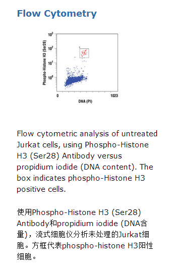 Phospho-Histone H3 (Ser28) Antibody detects endogenous levels of histone H3 only when phosphorylated at Ser28. This antibody does not cross-react with other phosphorylated histones, including phospho-histone H3 (Ser10).
