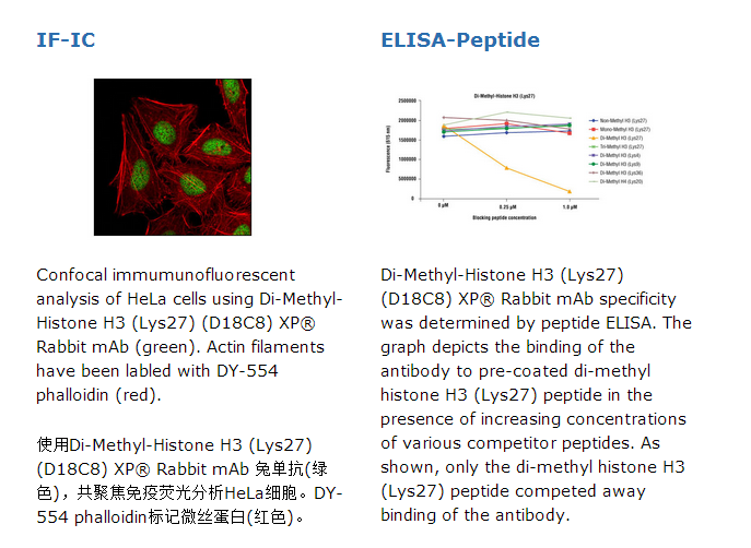Di-Methyl-Histone H3 (Lys27) (D18C8) XP® Rabbit mAb兔单抗能够检测仅在Lys27位点双甲基化的内源性histone H3的蛋白水平。该抗体不能与Lys27位点非甲基化、单甲基化或三甲基化发生交叉反应。另外,该抗体也不与histone H3蛋白Lys4, Lys9, Lys36位点或histone H4蛋白Lys20位点的双甲基化或三甲基化发生交叉反应。通过合成的仅在lysine 27位点双甲基化histone H3蛋白氨基端相应的多肽片段去免疫动物从而制备出此单克隆抗体。核小体是由四种组蛋白(H2A、H2B、H3和H4)组成,它是染色质的主要构成模块。起初被认为作为一个DNA包装的静态支架,现在则显示组蛋白是动态蛋白,经历多种翻译后修饰的形式,包括乙酰化、磷酸化、甲基化和泛素化(1)。组蛋白甲基化对于该基因组的活化和未活化区域的形成有着主要决定作用,并且在发育期间对该基因组的正确规划起着关键作用(2,3)。histones H3 (Arg2、17、26)和H4 (Arg3)的精氨酸甲基化促进转录调控以及通过蛋白质精氨酸甲基转移酶(PRMTs)家族的介导,包括共激活因子PRMT1和CARM1 (PRMT4) (4)。相反,多种多样的组蛋白赖氨酸甲基转移酶已经被鉴定,除了这个之外其它的都包含一个保守的催化SET区域,这个起初被鉴定在Drosophila Su(var)3-9、zeste增强子和Trithorax蛋白。赖氨酸甲基化主要发生在histones H3 (Lys4、9、27、36、79)和H4 (Lys20),并且已经涉及到转录激活和沉默(4)。这些赖氨酸残基的甲基化协调染色质修饰酶的招募包括methyl-lysine结合模块例如chromodomains (HP1, PRC1)、PHD fingers (BPTF, ING2)、tudor domains (53BP1)和WD-40 domains (WDR5) (5-8)。组蛋白例如PADI4、LSD1、JMJD1、JMJD2和JHDM1的发现已经显示甲基化是一个可逆的表遗传标记物(9)。