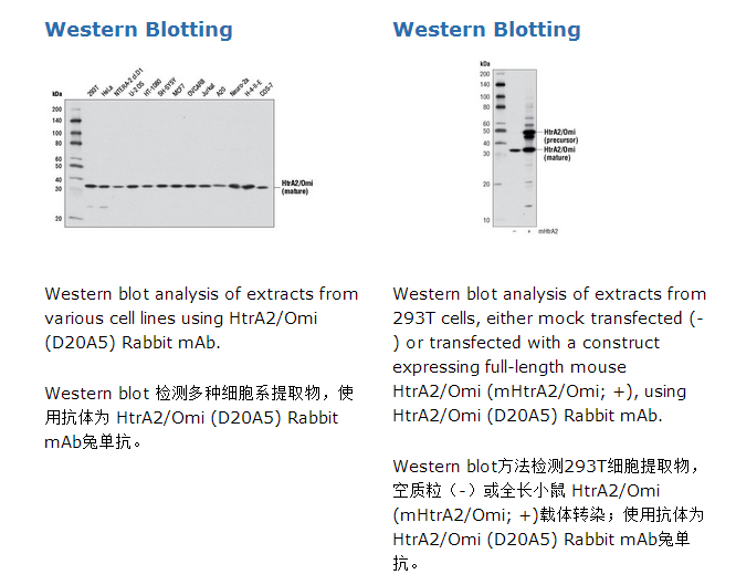 HtrA2/Omi (D20A5) Rabbit mAb兔单抗能够检测内源性的HtrA2/Omi 总蛋白。该抗体不会与HtrA1产生交叉反应。 该单克隆抗体是采用合成的人源HtrA2/Omi蛋白Phe341周围残基相对应的肽段免疫动物而制备的。蛋白A2(HtrA2)/Omi是一种丝氨酸蛋白酶,与大肠杆菌的HtrA蛋白(DegP) 同源,研究表明其参与细胞凋亡及蛋白错误折叠引起的降解等过程(1)。最初的研究表明HtrA2存在于细胞核(1)或粗面内质网(2)中,后来的研究证明HtrA2存在于线粒体上,在细胞凋亡过程中被释放出来(3-8)。HtrA2产生时是50 kDa的酶原,之后被裂解成36kDa的成熟蛋白,暴露出一个氨基末端基序(AVPS),AVPS类似于IAP抑制子Smac/Diablo(3-8)。与SMAC一样,HtrA2和IAP家族成员之间的相互作用,如XIAP,拮抗caspase活性的抑制,保护细胞免于凋亡(3-8)。有趣的是,在HtrA2基因敲除小鼠模型中,并没有显示出细胞凋亡的减少,而是出现了纹状体中的神经元缺失和帕金森样表型,这表明HtrA2可能具有神经保护功能(9-11)。该活性与HtrA2的蛋白酶活性有关(9)。此外,研究已经在帕金森病中发现了HtrA2基因功能缺失的突变体(12)。