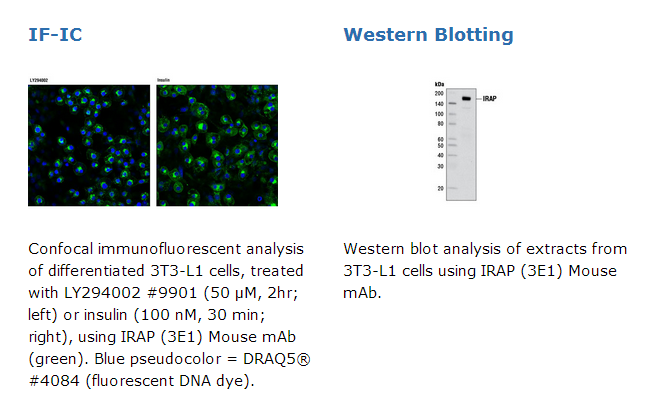 IRAP (3E1) Mouse mAb识别内源性IRAP总蛋白水平。单抗通过用与小鼠IRAP氨基端序列相同的融合蛋白免疫动物而得。IRAP(也称作LNPEP)最初认为是一种位于含Glut4囊泡上的胰岛素反应性氨肽酶(1)。它不仅与Glut4有严格的共定位,而且由胰岛素刺激的蛋白转位模式也与Glut4相同(2)。因此,普遍认为IRAP是Glut4的一个很好的标志(2)。后来发现IRAP是一种调控着一些激素和调节蛋白表达与活性的关键酶(3,4)。作用一种锌依赖型的半胱氨酸氨肽酶膜蛋白,IRAP不仅是血管紧张素的受体,同时它也调控着血管紧张素原前体生成血管紧张素的生化途径(5)。IRAP在一些肽酶的水解过程中起催化作用,这其中包括催产素和加压素等(4)。IRAP的异常表达跟人体的几种癌症相关,包括肾脏癌症和子宫内膜癌(6,7)。