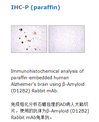 β-Amyloid (D12B2) Rabbit mAb兔单抗能够检测内源性的β-淀粉样肽(Aβ)。该抗体检测Aβ多种亚型,如Aβ-37,Aβ-38,Aβ-39,Aβ-40和Aβ-42。该抗体的抗原与大鼠并非100%保守。然而,该抗体能够在检测小鼠Aβ的同时,小鼠和大鼠抗原周围侧翼序列也100%会被检测到。该单克隆抗体是由合成的人源β-淀粉样肽(Aβ)N末端肽段免疫动物而制备的。β淀粉样蛋白(Amyloid β, Aβ)前体蛋白(Amyloid β precursor protein, APP)是分子量为100-140 kDa的跨膜糖蛋白,它拥有几个亚型(1)。APP的氨基酸序列中所包含的淀粉样蛋白域(A-β),能够通过两步蛋白裂解反应被释放出来(1)。释出的A-β片段在细胞外沉积积累,形成了阿尔茨海默病(Alzheimer's disease,AD)中淀粉样斑块的主要组成部分(1)。APP存在多个能够被磷酸化的位点,这些位点影响着蛋白本身的裂解和分泌过程(2-5)。细胞周期蛋白依赖性激酶介导的Thr688(对应于APP695亚型)磷酸化是细胞周期依赖的,在G2/M期达到峰值(4)。APP的Thr668磷酸化形式存在于成年大鼠大脑和相应的培养神经细胞及其分化细胞中(5,6)。