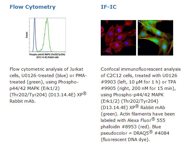 Phospho-p44/42 MAPK, Phospho-SAPK/JNK and Phospho-p38 MAPK Antibodies only recognize the phosphorylated forms of p44/42 MAPK, SAPK/JNK and p38 MAPK, respectively. They do not significantly cross-react with other MAPK family members.