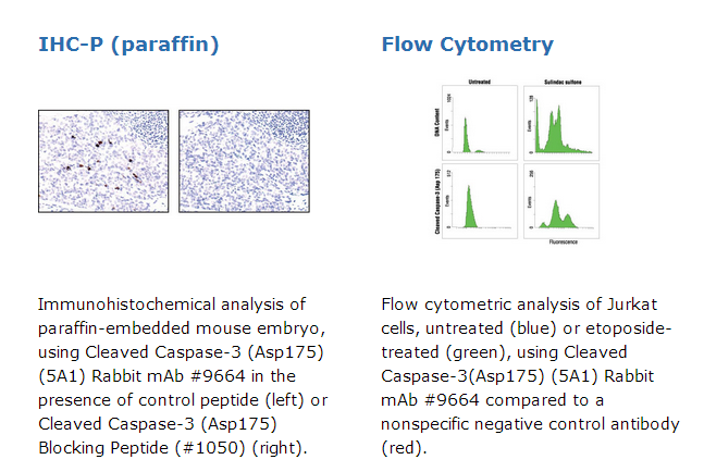 Each antibody in the Apoptosis Antibody Sampler Kit detects endogenous levels of its respective protein. Cleaved Caspase-3 (Asp175), Cleaved Caspase-7 (Asp198) and Cleaved PARP (Asp214) Antibodies recognize only the large fragments of their respective cleaved proteins. Cleaved Caspase-9 (Asp330) Antibody recognizes either the 37 kDa (with prodomain) or 17 kDa large fragment of the cleaved protein. Caspase-3, Caspase-7, Caspase-9 and PARP Antibodies recognize both the full length and large cleaved fragments of their respective proteins.