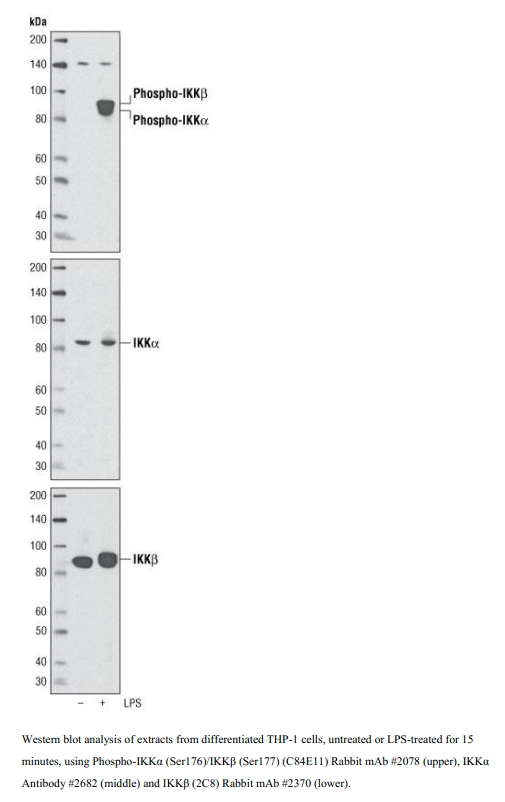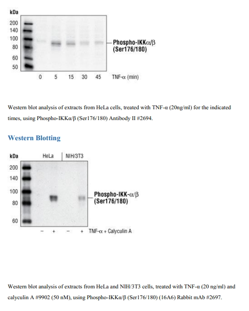 Polyclonal antibodies #2687 and #2694 are produced by immunizing rabbits with a synthetic phosphopeptide corresponding to residues surrounding Ser176/180 of human IKKα and Ser177/181 of IKKβ, respectively, and are purified by protein A and peptide affinity chromatography. Monoclonal antibody #2697 is produced by immunizing rabbits with a synthetic phosphopeptide corresponding to residues surrounding Ser176/180 of human IKKα.