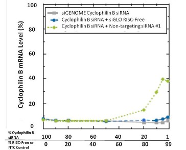 Figure . Silencing efficiency of siCONTROL™ Cyclophilin B siRNA in the presence of increasing amounts of siGLO™ RISC-Free™ siRNA. HeLa cells were co-transfected with a constant concentration of siRNA (100 nM) comprised of increasing ratios of Cyclophilin B siRNA:RISC-Free™ (or Non-Targeting) siRNA. For comparison, a parallel set of samples included cells transfected with cyclophilin B siRNA alone. After 24 hours, cyclophilin B mRNA levels were measured using a branched DNA assay (Genospectra).When unmodified, nontargeting siRNA is included in the transfection mix, the level of targeted gene silencing is reduced in a dose-dependent fashion suggesting competition for the silencing machinery. In contrast, when RISC-Free™ siRNA is a part of the transfection mix, no effect on the silencing efficiency (no competition) is observed.