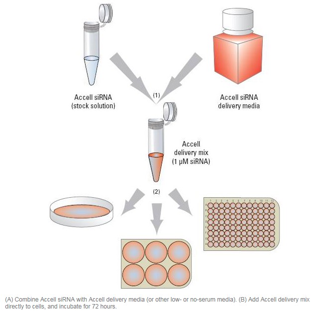 • Accell siRNA enters cells without the need for transfection reagents, virus (or viral vectors), or instruments