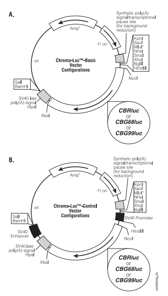 Normalizing the expression of an experimental reporter to the expression of a control reporter can help to differentiate specific from nonspecific effects of cell-treatment protocols. We have developed a luciferase-based technology, the Chroma-Luc™ Series Reporter Vectors. The Chroma-Luc™ Vectors include a vector encoding one red-emitting luciferase (CBRluc) and two vectors encoding green-emitting luciferases (CBG68lucand CBG99luc). The design of the synthetic Chroma-Luc™ genes is based on a native Yellow-Green luciferase gene originally cloned fromPyrophorus plagiophthalamus, a large click beetle indigenous to the Caribbean. To ensure reliability and high levels of expression, the Chroma-Luc™ genes have been codon optimized for mammalian expression and cleared of most known consensus transcription factor binding sites. In addition, the predicted peroxisome targeting sequences have been removed. Upon addition of the luciferase substrates, the engineered CBRlucluciferase emits red light (613nm), which has optimal color separation from the corresponding 537nm green-emitting Chroma-Luc™ luciferases (i.e., CBG68lucand CBG99luc).