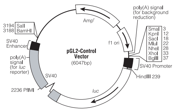 pGL2 Luciferase Reporter Vectors (pGL2 萤光素酶报告基因载体) 为定量分析潜在调节哺乳动物基因表达的因子提供基础。这些因子可以是顺式作用元件,如启动子和增强子,或是反式作用元件,如各种DNA 结合因子。pGL2 载体带有萤火虫(Photinus pyralis )萤光素酶的编码区,可用来监测被转染真核细胞的转录活性。这种报告基因的检测快速、灵敏并且是可定量的。另外,pGL2 载体具有很多特点,有助于了解所研究的假定调控序列的结构特征和基因突变。