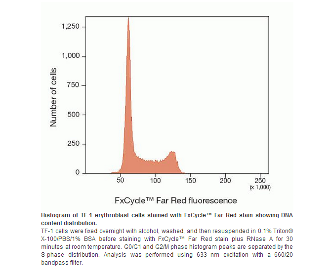 FxCycle™ Far Red stain (F10348) is used for flow cytometric analysis of DNA content in fixed cells when combined with RNAse. This dye takes advantage of the commonly available 633⁄5 nm excitation sources with emission around 660 nm. With multicolor cell cycle studies possible using flow cytometry, it is often necessary to analyze DNA content on alternative lasers to preserve the common 488 nm laser and detection channels for other markers. Well suited for the popular red laser, FxCycle™ Far Red stain is a good choice for DNA content analysis in multicolor cell cycle studies.