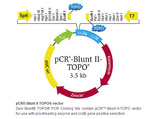 Efficient cloning With up to 95% of clones carrying the desired insert, you can screen less clones, saving you time and money. The pCR®Blunt II-TOPO® vector used in this kit comes with lethal ccdB gene for efficient selection of blunt-ended PCR recombinants products generated bythermostable proofreading polymerases.