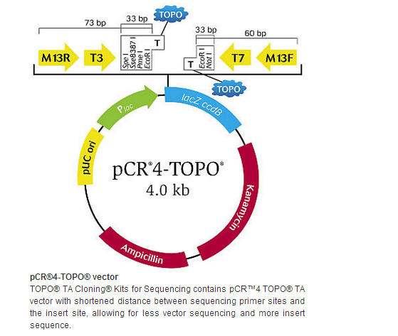 用于测序的 Invitrogen TOPO® TA 克隆试剂盒 (TOPO® TA Cloning Kit for Sequencing) 可提高 PCR 产物的克隆速度,简化测序过程。 该试剂盒包含的 pCR®4 载体骨架在多克隆位点 (MCS) 区具有最少的限制性酶切位点,因此 T7 和 T3 引物位点离 PCR 产物克隆插入位点仅 33 bp。 这意味着测序的片段中,插入片段的比例增高,而载体序列的比例减少。 TOPO® 克隆可确保克隆的可靠性;通过三步实验方案,只需 5 分钟即可产出高达 95% 的重组体。 用于测序的 TOPO® TA 克隆试剂盒带有 pCR®4-TOPO® TA 载体,并具有以下方便特性: • 最少的载体多克隆位点 (MCS) 确保更多的插入片段得到测序 • 具有 3’ T 突出端,可直接连接 Taq 酶扩增的 PCR 产物 • 具有 T7 和 T3 启动子,可高效进行体外转录 • 具有用于测序的 M13 正向与反向引物位点 • 具有卡那霉素和氨苄青霉素抗性,可选择 E. coli 筛选方式 • 通过简便的蓝⁄白斑筛选选择重组体 • 包含 OneShot® TOP10 感受态细胞,通过更方便的操作获得最高的克隆效率。