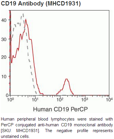 CD19 is a member of the immunoglobulin superfamily and has two Ig like domains. The CD19 molecule is expressed on 100% of the peripheral B cells as defined by expression of kappa or lamda light chains. It appears to be expressed on myeloid leukemia cells, particularly those of monocytic lineage. Leukemia phenotype studies have demonstrated that the earliest and broadest B cell restricted antigen is the CD19 antigen. The receptor for CD19 is an important functional regulator of normal and malignant B cell proliferation. It is expressed in all B cell precursor leukemias.