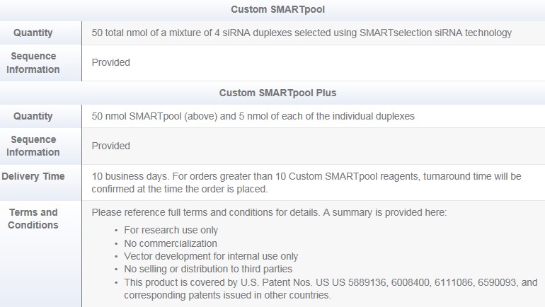 To complement our pre-designed siRNA collections and support a broad range of RNAi experiments, our siRNA design experts can provide Thermo Scientific custom SMARTpool reagents targeting genes outside of our genomewide offerings, like specific isoforms and splice variants or alternative species.