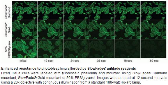 Get Photobleaching Protection Across the Entire Visible and IR Spectrums No matter which fluorescent dyes or fluorescent proteins you are using, SlowFade® Diamond mountant helps provide the best protection against photobleaching. It is proven to have best-in-class performance against a wide array of fluorescent dyes, including Alexa Fluor® dyes, FITC, TRTC, Texas Red®, Cy®3, and Cy®5. SlowFade® Diamond does not quench, and its ability to provide brighter signal, against no background, helps ensure that you obtain the best-quality, high resolution images for publishing.