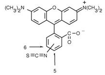 The thiol-reactive tetramethylrhodamine-5-(and-6)-isothiocyanate (5(6)-TRITC)can be used to can be used to create bright orange-red-fluorescent bioconjugates with excitation/emission maxima ~555/580.
