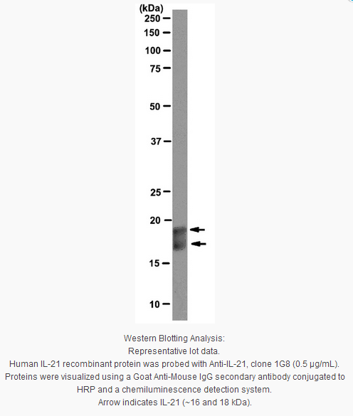 Evaluated by Western Blot from human IL-21 recombinant protein.