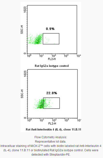 Flow Cytometry Analysis: 10 µg of this antibody detected IL-4 in MiCK-2™ cells.