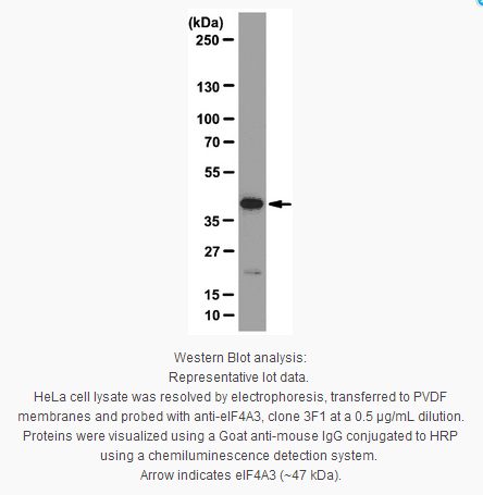 Western Blot Analysis: 1 µg/mL of this antibody detected eIF4A3 on 10 µg in HeLa cell lysate.
