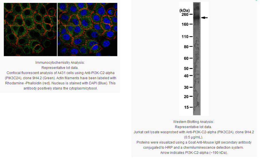 Anti-PI3 Kinase-C2-alpha Antibody, clone 9H4.2 detects level of PI3 Kinase-C2-alpha & has been published & validated for use in WB & IC.