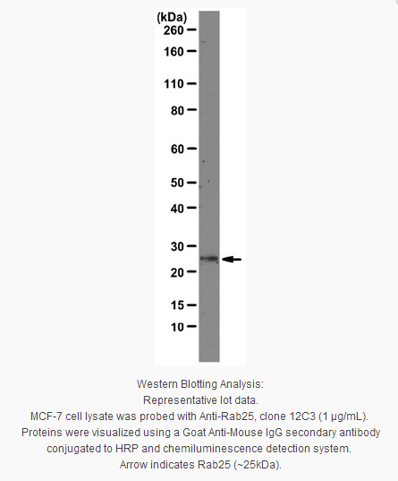 Ras-related protein Rab-25 (Rab25) is a GTP-binding protein belonging to the Rab family of proteins. Rab25 has observed expression in kidney, lung and gastrointestinal mucosa, appearing to be exclusively expressed within epithelial cells. This specific expression has led to the implication that Rab25 has a role as a regulator for vesicular transport associated with epithelia. Rab25 is potentially a selective regulator for transcytotic pathways and apical recycling. Several recent studies have indicated an observable loss of Rab25 in breast cancer tissue and cell lines, and have suggested a potential role for Rab25 as a regulator for Ras induced tumorigenesis.